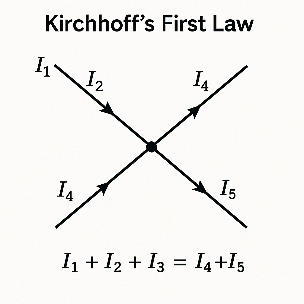 키르히호프의 전류 법칙은 회로 내의 특정 지점, 즉 노드(Node)에서의 전류 흐름에 대한 법칙입니다. 이 법칙은 '어떠한 노드에서든지 들어오는 전류의 총합은 나가는 전류의 총합과 같아야 한다'는 원리를 기반으로 하며, 이는 전하 보존의 법칙에 근거를 둡니다.